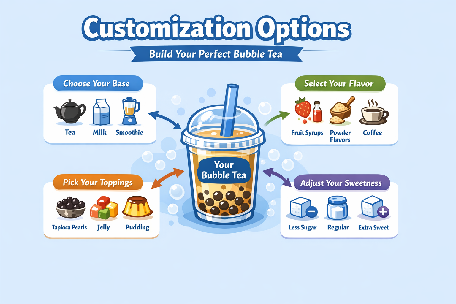 - Toppings (perles, jelly, mousse)